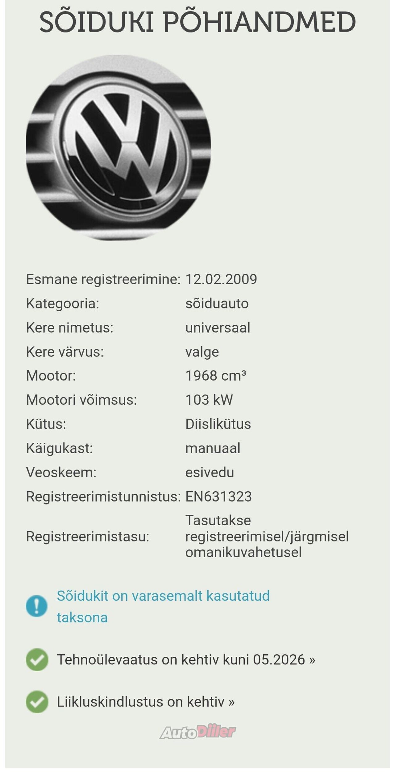 Calculated values are indicative! The annual tax is payable twice a year (50% by June 15 and 50% by December 15) and consists of a base fee, emissions and weight component, both of which steer users towards less polluting and lighter cars. NB! The calculated result is based on the data in the ad and may differ from reality if the data is inaccurate or incomplete! NB! The result is calculated as of January 1st!