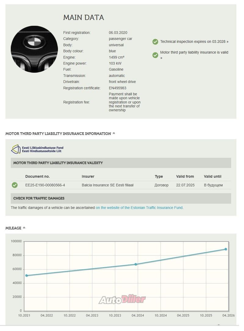 .-Aastamaks (226€) makstud. Auto on poleeritud ja salongi on tehtud keemiline puhastus. .-Mugav kaugjuhtimise rakendus telefoni kaudu auto juhtimiseks. .-Väga ökonoomne ja mugav auto, kõik lisad töötavad ilusti. .-Viimane täielik hooldus tehtud 86 256km peale 02.2026a. .- Auto pole olnud üheski avariis ja ükski detail pole ülevärvitud. Sõiduk BMW 218I GRAN TOURER (286PXH) on liiklusregistris registreeritud ja ei ole osalenud üheski liikluskindlustuse juhtumis. ---------------------------------------------------------------------------------------------------- .-Годовой налог (228€) оплачен. Автомобиль отполирован и выполнена химчистка салона. .-Удобное дистанционное приложение с телефона по управлению автомобилем. .-Очень экономичный и комфортный автомобиль, все опции работают отлично. .-Последнее полное ТО проведено на пробеге 86 256 км в 02.2026г .-Автомобиль не был в авариях, ни одна деталь не перекрашивалась. Транспортное средство BMW 218I GRAN TOURER (286PXH) зарегистрировано в дорожном регистре и не участвовало ни в одном страховом случае.
