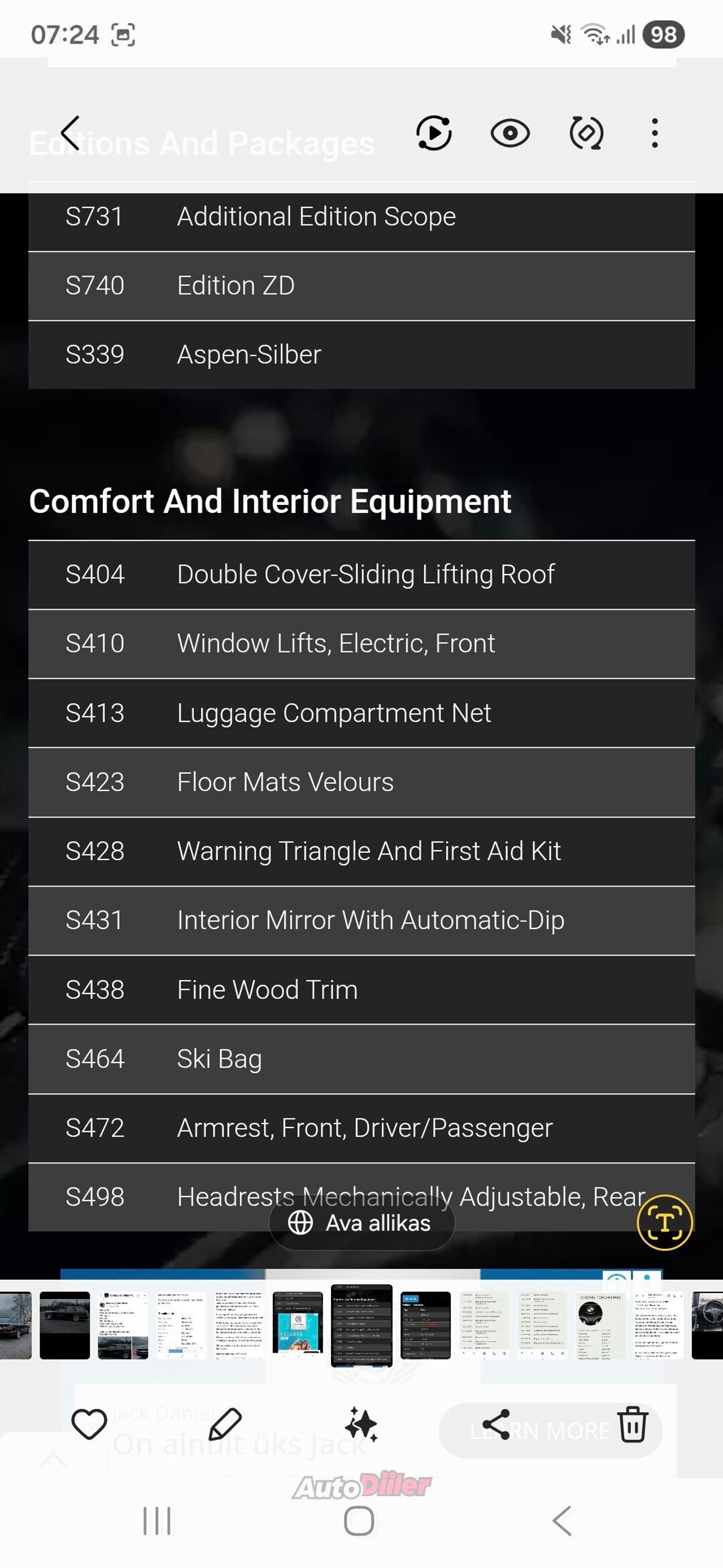 Panen siis huvipärast siis müüki oma hobiauto Bmw E34 525 TDS Touring manuaalkäigukastiga 1995.a. Autol karbid vahetatud, keretööd tehtud. PunasekPanens kiletatud. Viimased talved sõidetud pole. Peal on 2.4 mehaaniline pump ehk käivitusprobleeme pole. Saanud kõvasti remonti. Esisillas kõik kaikad, sisselaskekollektori tihendid, uued eelsüüteküünlad+plokk. Sillastend. Õli+filtrid, uus genekas. Uued kettad/klotsid. Käsipiduritross koos juurdekuuluvaga. Käivitus ka -27c paugust. Kere hea. Must lagi, panoraankatuseluuk, taga ustel kardinad, el-aknad, must nahktuba, juhiiste sport. Kompu, Pioneeri BT-stereo, ees udutuled, teisaldatav kärukonks, shadowline. Auto passis värvimuutus tehtud. Uus tagumine sumbuti pütt. Ei tahma kuna enne ülevaatust sai pumpa maha keeratud. Armatuuris üleliigseid tulesid ei põle. Soojaks läheb kiiresti. Keemismuresid ega käivitusprobleeme ei esine. Paak hoitud täis. Talvel aeg-ajalt käivitatud ja liigutatud, et pidurid kinni ei jääks. Karpidele sisse lastud ka roostemuundurit. Konditsioneer. Ees käetoed. 3-kodaraga rool. 16" originaal valuveljed. 2tk suverehvid, 2tk lamellid peal. Kaasa originaal plekkveljed lamellrehvidega. Registreerimistasu on makstud!!! Omanikuvahetus: 55€ Aastamaks 50€ makstud. Saabuvaks kevadeks kindlasti väga pilkupüüdev ja hea hobiauto. Kerel potensiaali kõvasti ja, kes korras TDS'i ikka ei taha saab alati M57D30 swapi teha. Istmesoojendused ka töötavad. Osa arveid tehtud tööde kohta tuleb kaasa. Alla said uued 18" randiga valuveljed, millel uued Sailuni 255/35 ZR18 rehvid peal. Ees coiloverid. Taga uued TRW-amordid. Originaal tõstekohtadest kannatab ilusti tõsta. Uus sumbuti tagapütt. Hinnas ei TINGI!!!