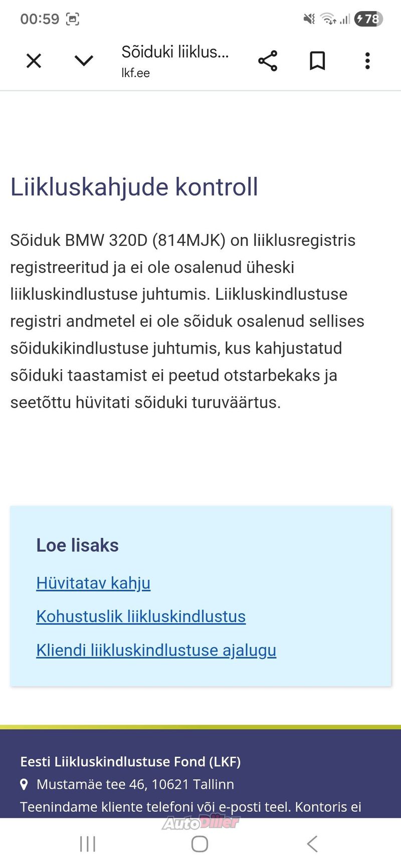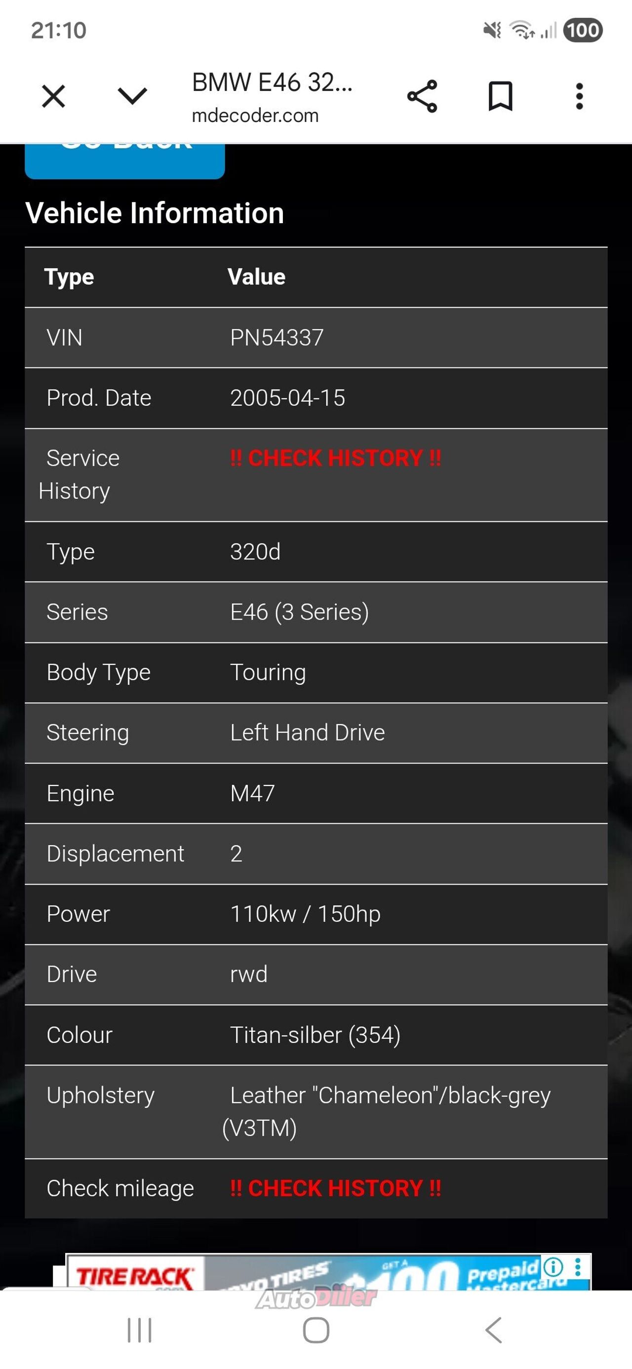Müüa heas sõidukorras Bmw E46 320d Touring 110kw 2005.a. Automaatkäigukastiga. Tehasest vähe parema lisavarustusega, mis ka kõik töötab. Must korralik sportsisu, 4x-el.aknad, istmesoojendused, kompuuter, must lagi, ekektriline klaasist katuseluuk, kliima, püsikiirusehoidja, multirool, toonklaas, parkimisandurid, ees udutuled, Android 2DIN-kõigi võimalustega puutetundlik BT-stereo. Subwoofri juhtmed veetud, sportpütt(diislil ei lärma). Väidetavalt ka mingi chip peal. Liigub paremini kui stock 110kw. Taga käetugi topsihoidjatega. Kesklukk/signa puldist. Ees mustad neerud. Veermik ei kolise. 16" originaal valuveljed suverehvidega. Tagaluugi klaas käib eraldi ilusti lahti. Esituled ilusad ja näitavad väga hästi. Käsipidur, veermik pidurid korras. Hiljuti läbinud ülevaatuse puhta lehega. Kerepoolest kõvasti üle keskmise. Karpidel tõstepunnid alles. Märgatavat roostet näha pole. Õrni mulle kuskilt otsida ikka leiab. Uus aku. Käivitub hästi, kast hea, mootoril lekkeid pole tuvastanud. Esiklaasil all mõra kojameeste juures, mis ülevaatust pole aastaid seganud. Väga ökonoomne. Maanteel hetkel 4sajale. Läheb kiiresti soojaks ja keema ei lähe. Omanikuvahetuse saame teha mugavalt ja kiirelt transpordiameti e-teeninduses kohapeal+ostu-müügilepingud. Iluvigu otsida siis ikka leiab. Teepeale pole kunagi jätnud. LKF'i ajalugu puhas. Vahetuseks sobib Bmw X5 E70, X6 E71, E34, E32, E30 jne. Tehtud tööd - Kõik amordid - Akukast, karpide tagumised otsad, varuratta koht keevitatud - Taga parem rattalaager - Enamus puksid tagasillas - rooliotsad.