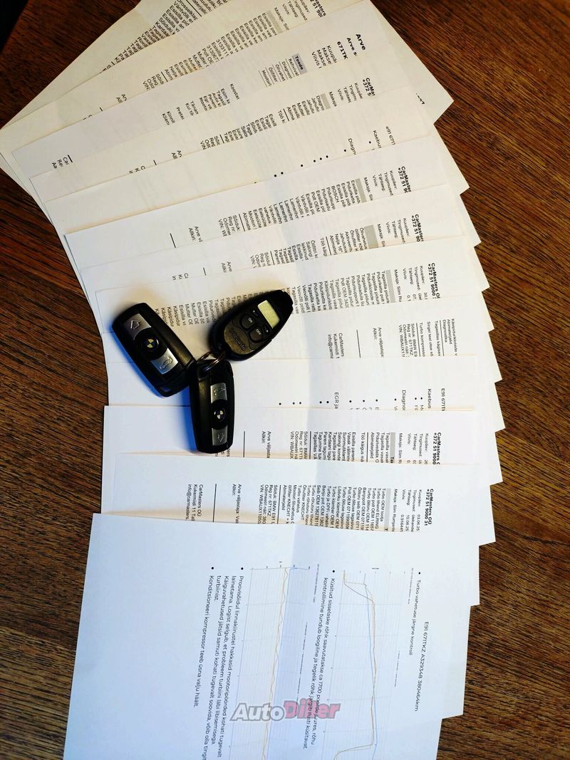 Kaasa tulevad ühe hooaja sõitnud naastrehvid. Viimase nelja aasta jooksul on autol tehtud järgmised tööd: Vahetatud mõlemad esisilla amortisaatorid, vedrud ja stabilisaatorivarda otsad Vahetatud esisilla pidurikettad ja klotsid Vahetatud väntvõlli esimene rihmaratas ja rullikud + pinguti Vahetatud tagasilla pidurikettad, klotsid, pidurisupportid ning pidurivoolikud Vahetatud turbo Lisaks veel vahetatud mitmeid piduriketaste kaitseplekke, rattalaagreid, õõtshoobasid, käsipiduriklotsid, eelsüüteküünalde moodul. Autole on lisatud Webasto. Varustuse nimekiri: Comfort and interior equipment S494 Seat heating driver/passenger S417 Roller sun visor, rear door S4AE Armrest front, retractable S441 Smoker package S493 Storage compartment package S481 Sports seat S4CG Interior trim strips "satin-silber" matt Multimedia S6AB Control, Teleservices S620 Voice control S698 Area-Code 2 for DVD S644 Preparation f mobile phone w Bluetooth S6AA BMW TeleServices S609 Navigation system Professional Driver assistance and lightning S534 Automatic air conditioning S563 Light package S520 Fog lights S507 Park Distance Control (PDC), rear S522 Xenon Light S540 Cruise control S548 Kilometre speedo S502 Headlight cleaning system S521 Rain sensor Wheels and drive S2PA Locking wheel bolt S255 Sports leather steering wheel S2BW BMW LA wheel, double spoke 268 S205 Automatic transmission S249 Multifunction f steering wheel Environment and safety S868 Language version, Dutch S321 Exterior parts in vehicle colour S8SP Control unit COP S886 On-board literature, Dutch S863 Dealer List Europe S8SC Telematics access request,country-spec. S320 Deleted, model lettering S386 Roof railing S8S2 Coding, alarm signal S877 Omission of non-combined operation S8S3 Automatic locking during starting S302 Alarm system S843 Power reduction S845 Acoustic fasten seat belt reminder Individual equipment S775 Headlining anthracite Other equipment S1CD Brake Energy Regeneration S1CA Selection of COP-relevant vehicles S1CB CO2 equipment Asub Sakus +372 55671634